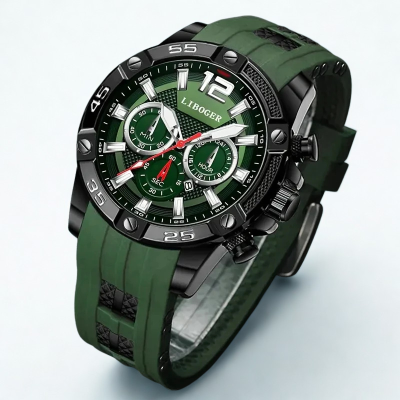 Inspirado en la calma del bosque y la fuerza de lo natural, este reloj verde está hecho para el hombre que encuentra equilibrio en cada respiro al aire libre. Un diseño elegante y sereno que acompaña con estilo los momentos de descanso, aventura y conexión con la tierra.